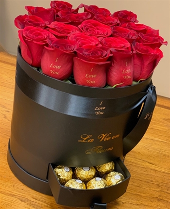 Our EXCLUSIVE Gift is made with embossed fresh roses arranged in a luxury hat flower box with Ferrero Rocher chocolate.