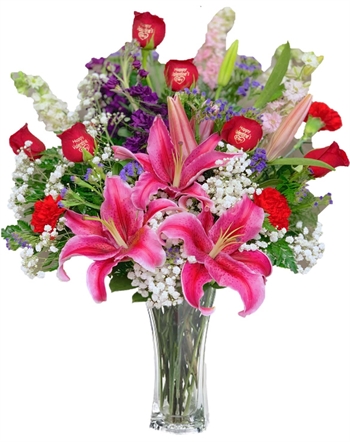 A gorgeous flower arrangement of fresh embossed premium long-stemmed red roses are mixed beautifully with stargazer pink lilies, purple stock, white larkspur, red carnations and baby’s breath situated in a superior 9-inch clear glass vase, are the perfect way to shine a light on your every emotion.